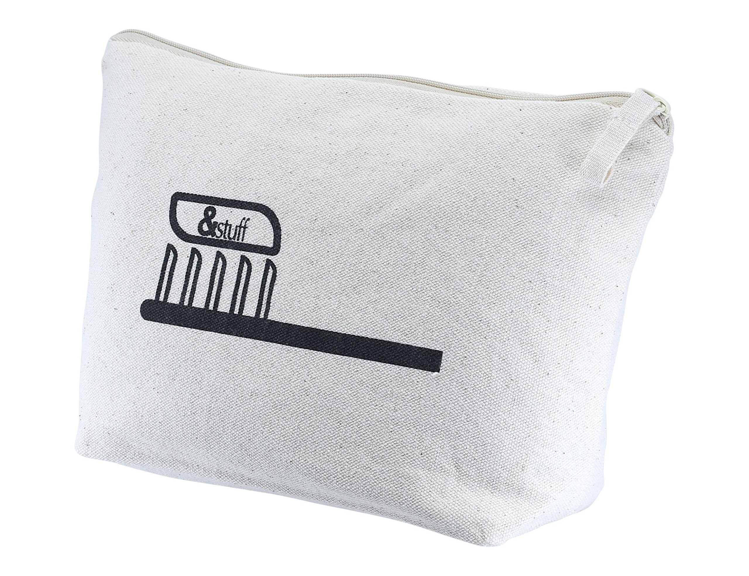 &Stuff is a range of user-friendly products designed with the environment in mind. All of the items in this on-trend range are hand made from 100% natural unbleached calico cotton and are durable, washable and reusable._x000D_nCalico Toiletry/Makeup Bag is the perfect accessory for keeping all your toiletries and makeup essentials safe and secure (lined with a water-resistant polyester inner). Your logo can be printed or debossed on one side of the pouch with our &Stuff icon printed on the reverse side._x000D_nOptions – select either: (1) natural or black coloured zip, (2) natural cotton zip puller or leatherette zip puller, (3) debossed logo onto the leatherette badge or screen printed directly onto the calico material (additional charges apply for some of these options – see below)._x000D_nNote: The stitched edges are folded inwards making the final product slightly smaller. Since these are stitched by hand, some variation is expected._x000D_n_x000D_nThis product is part of our &Stuff Calico Pocuhes. For full colour pouches, check out our Spectra rPET Range.