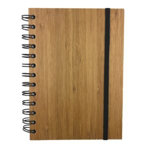 Stylish and functional medium-sized (approximately A5) wiro-bound notebook with a hard kraft cover. The notebook features 80 leaves (160 pages) of 70gsm lined cream paper made using sugarcane waste, with a sugarcane logo printed on the inside cover and the corner of each page. An elastic closure helps to keep notes secure.