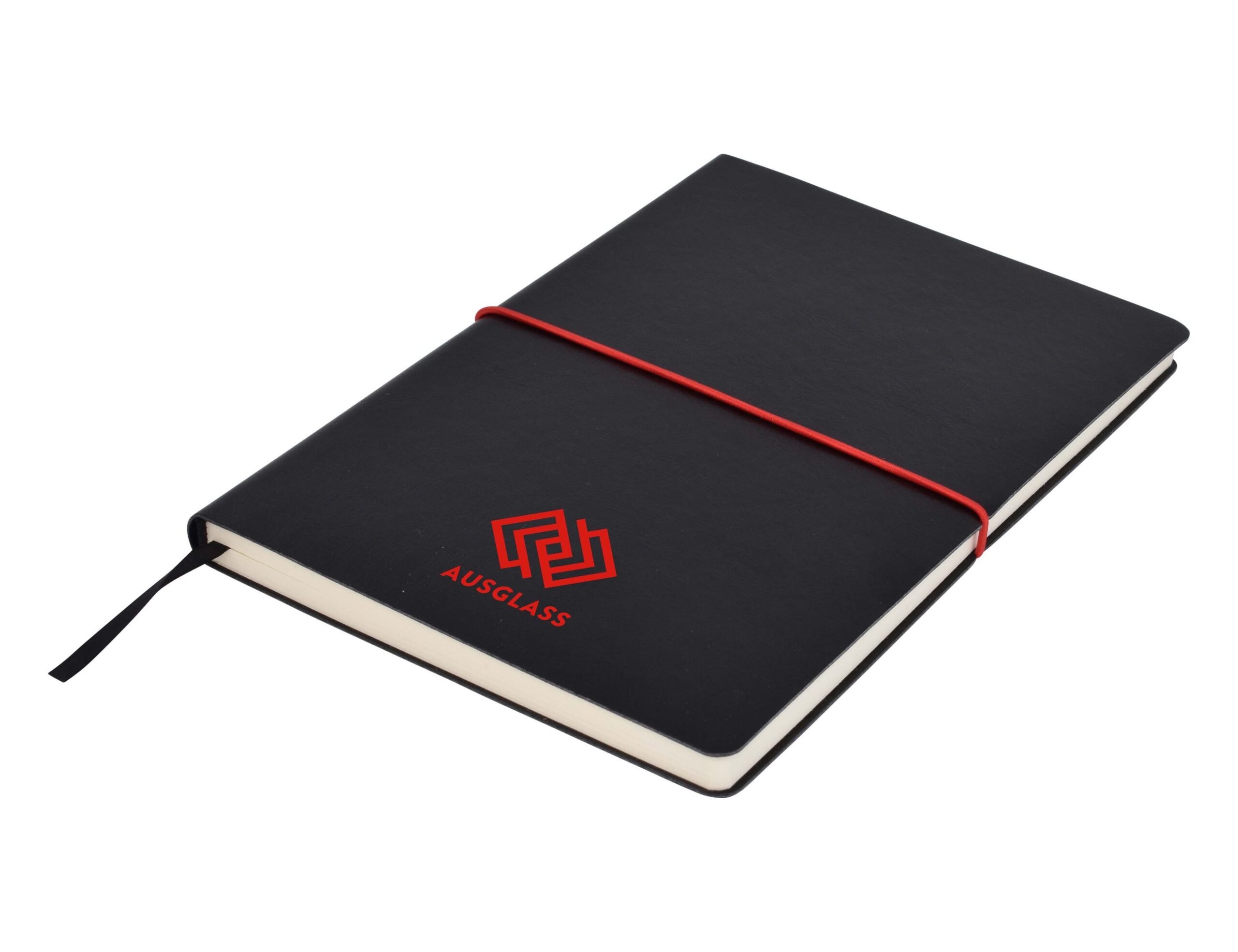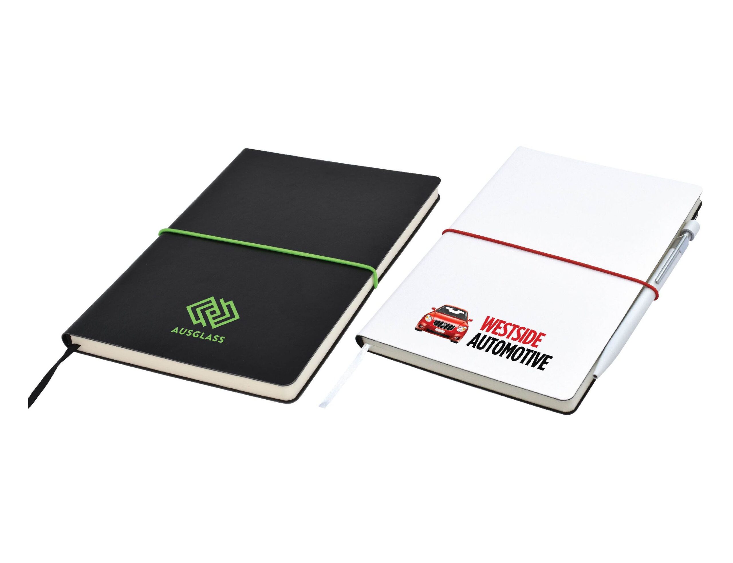 Tango Plus, styled in Europe, features a leather feel flexible cover with a choice of 8 vibrant coloured horizontal elastic closures which double as a handy pen loop (pen additional). Notebooks available in black or white with a choice of black, white, red, blue, purple, yellow, grey or green elastic closures. If you’re after a debossed notebook, check these out!_x000D_n_x000D_nNotebook Gift Box is an optional extra – see W17_x000D_n_x000D_n